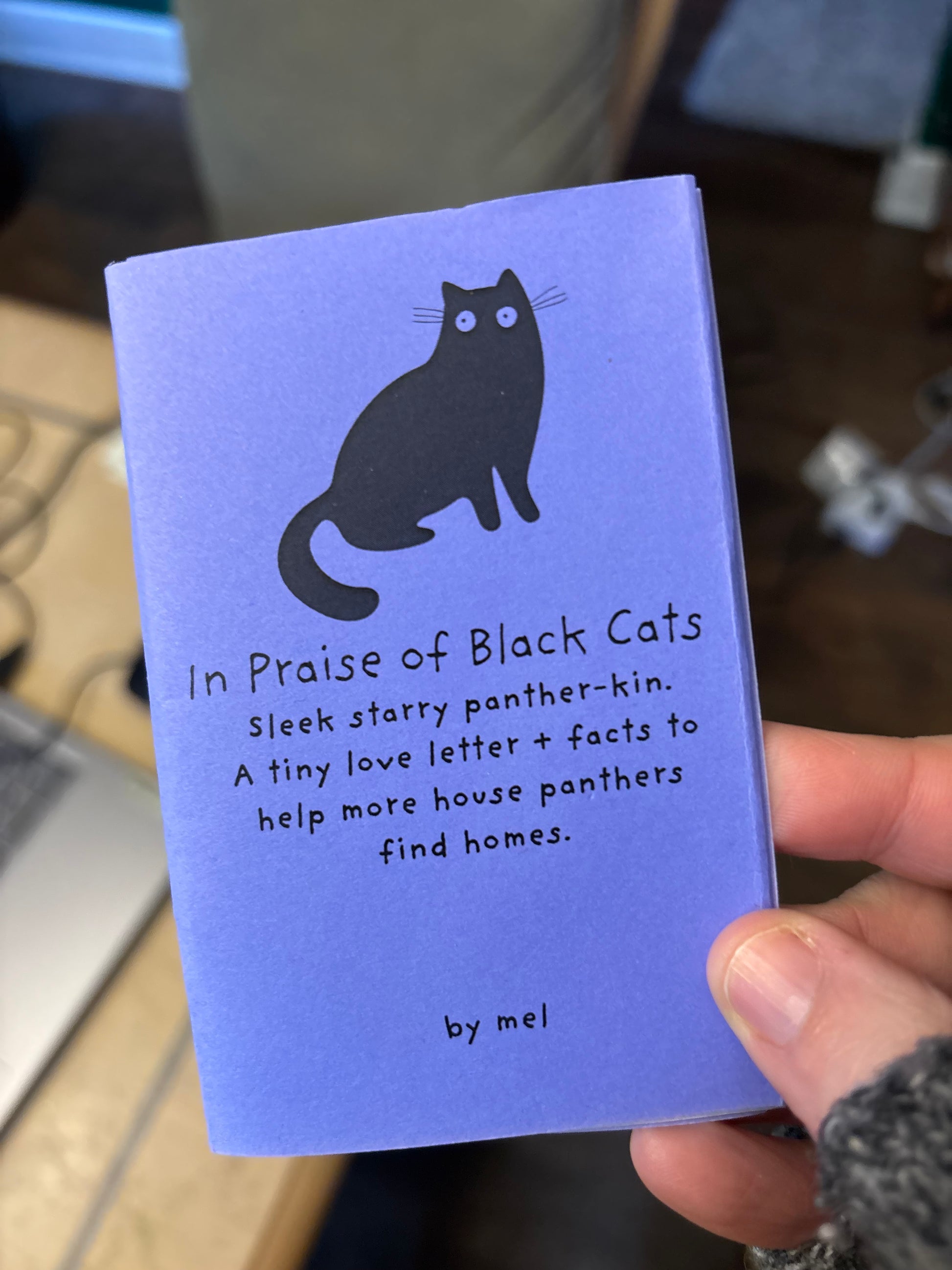 A tiny love letter to the world’s most luminous shadows. In Praise of Black Cats is a pocket-sized zine celebrating the mystery, charm, and deep, ancient magic of our inky-furred companions. Inside, you’ll find short musings, curious facts, tiny illustrations, and the soft reminder that black cats deserve more wonder and far fewer superstitions.